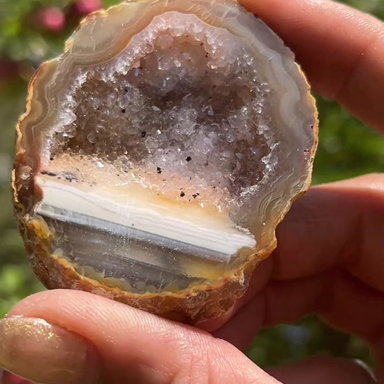 Add a touch of natural beauty to your collection with this stunning agate geode half. Featuring a beautiful, lined agate pattern, this piece opens up to reveal a sparkling crystalline center. The interior is filled with tiny, glittering crystals that catch the light, creating a dazzling display.