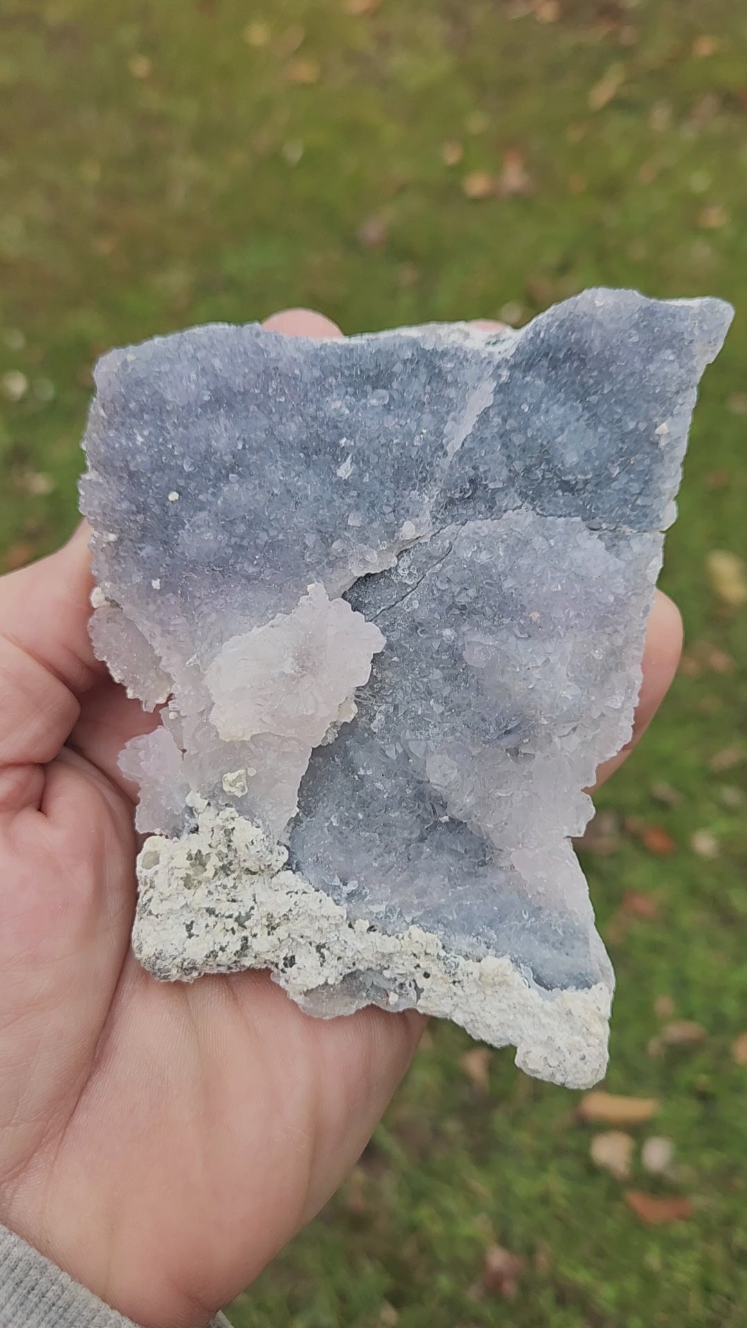 This striking Blue Mist Zeolite Cluster comes from Brazil and features a naturally soothing blend of blue-grey druzy crystals accented by soft lavender-to-rose toned secondary growths. The formation includes classic zeolitic microcrystals over a pale matrix, with shimmering texture and refined detail that collectors appreciate.