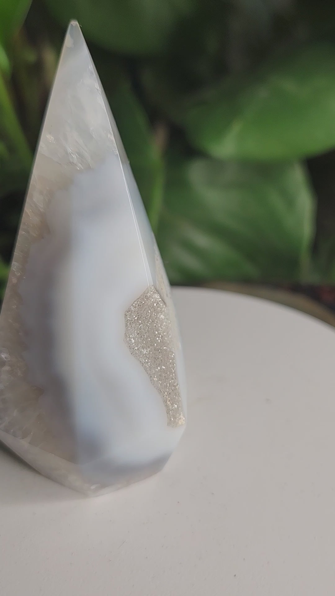 This stunning natural agate geode tower features a beautifully polished diamond-shaped point and a natural open druzy quartz cavity. Soft lavender chalcedony tones, earthy iron inclusions, and shimmering internal “diamond-like clarity zones” make this a standout display piece.