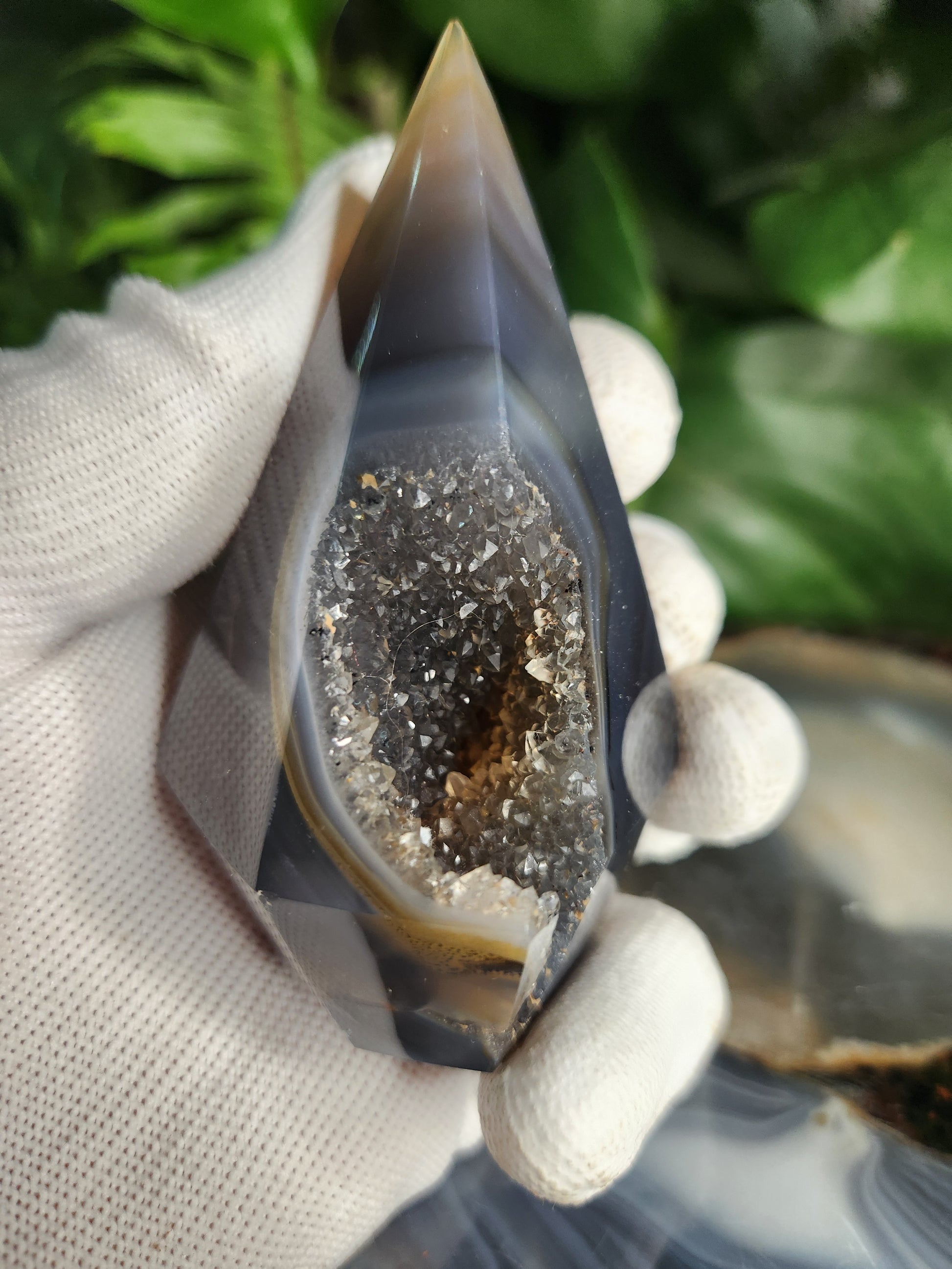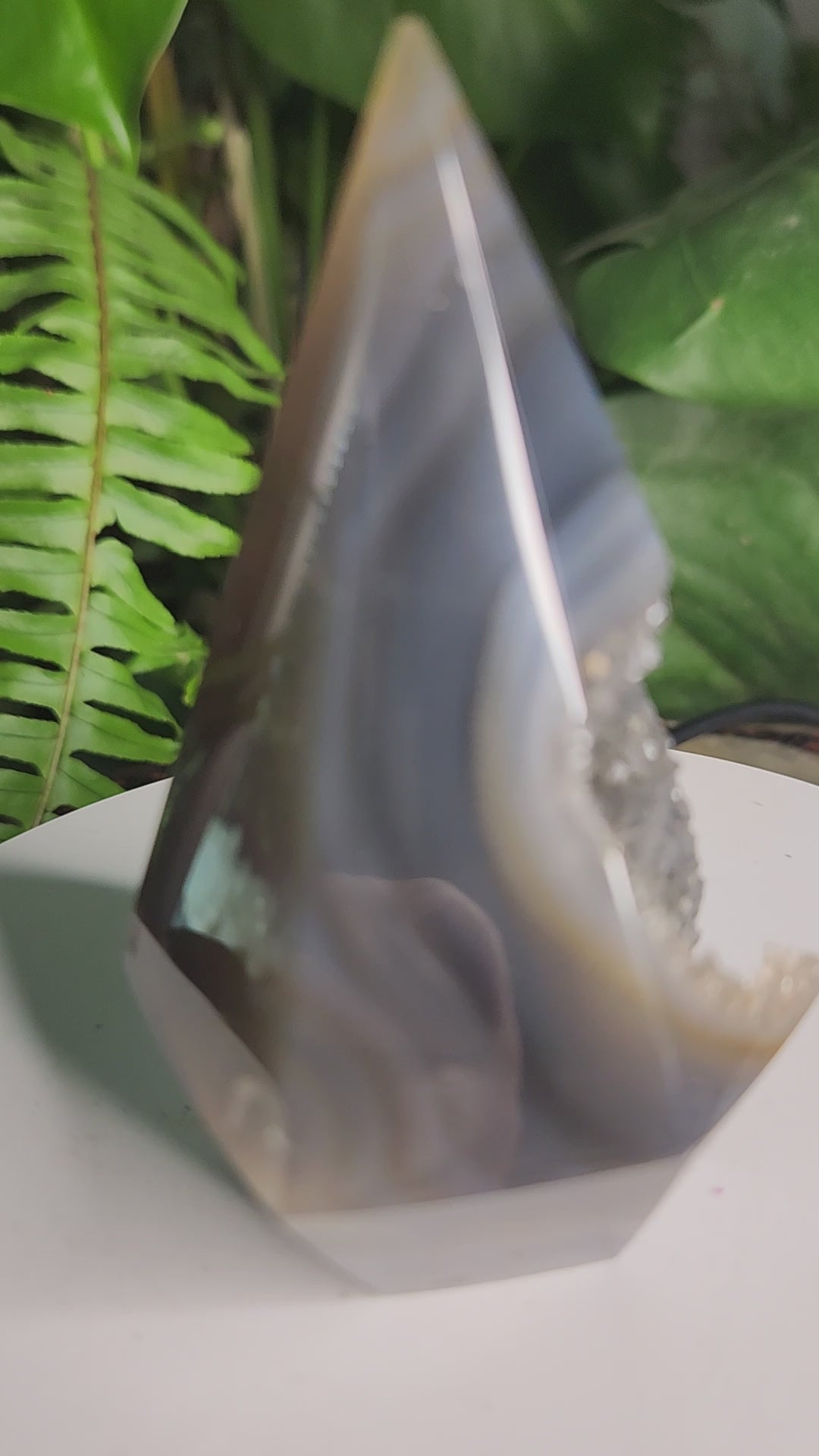 Discover the breathtaking beauty of nature with this exquisite Natural Agate Geode Diamond Point. Hand-polished to reveal its stunning layers and a sparkling geode cavity, this unique crystal tower is a true masterpiece of the earth.