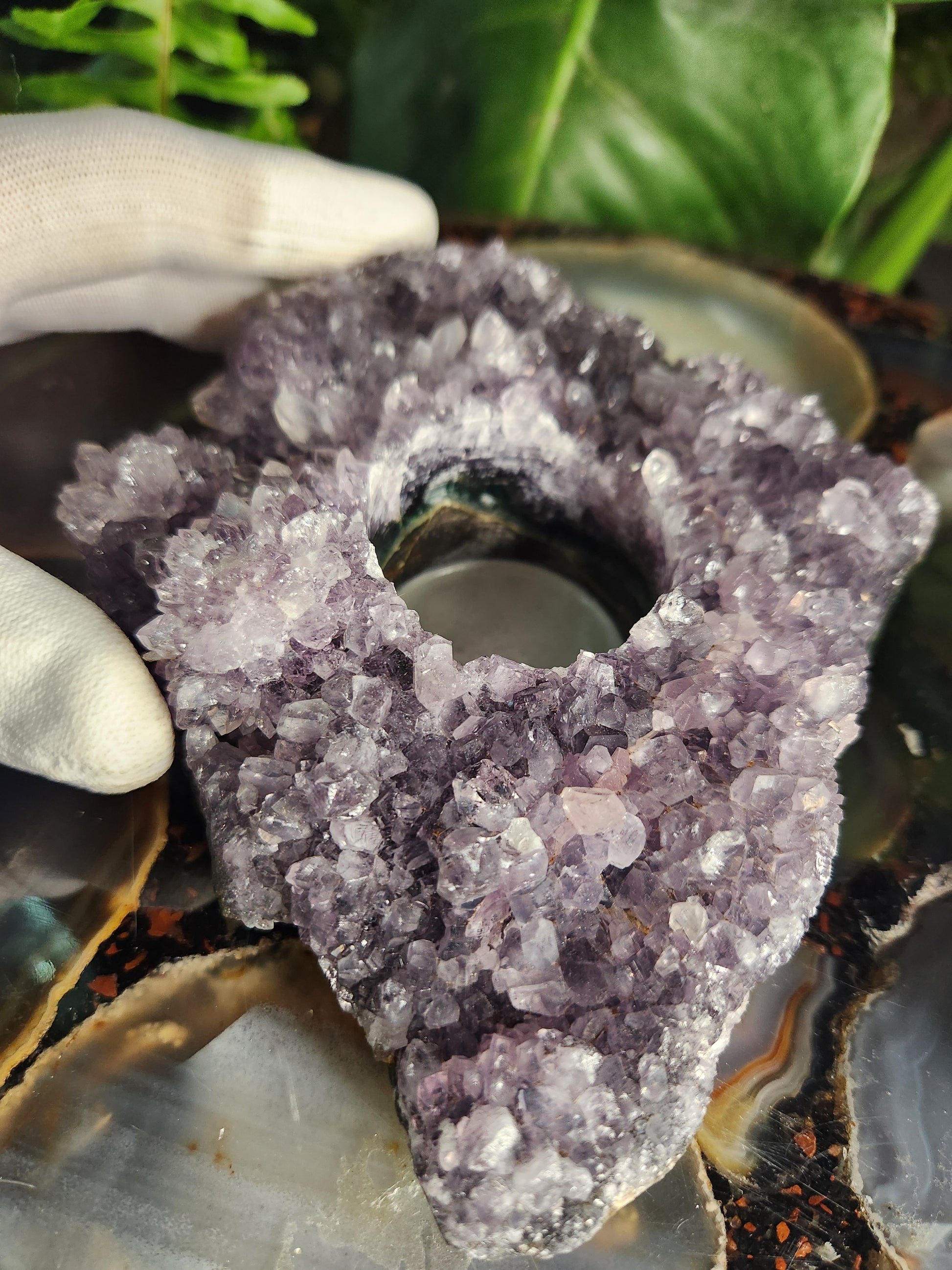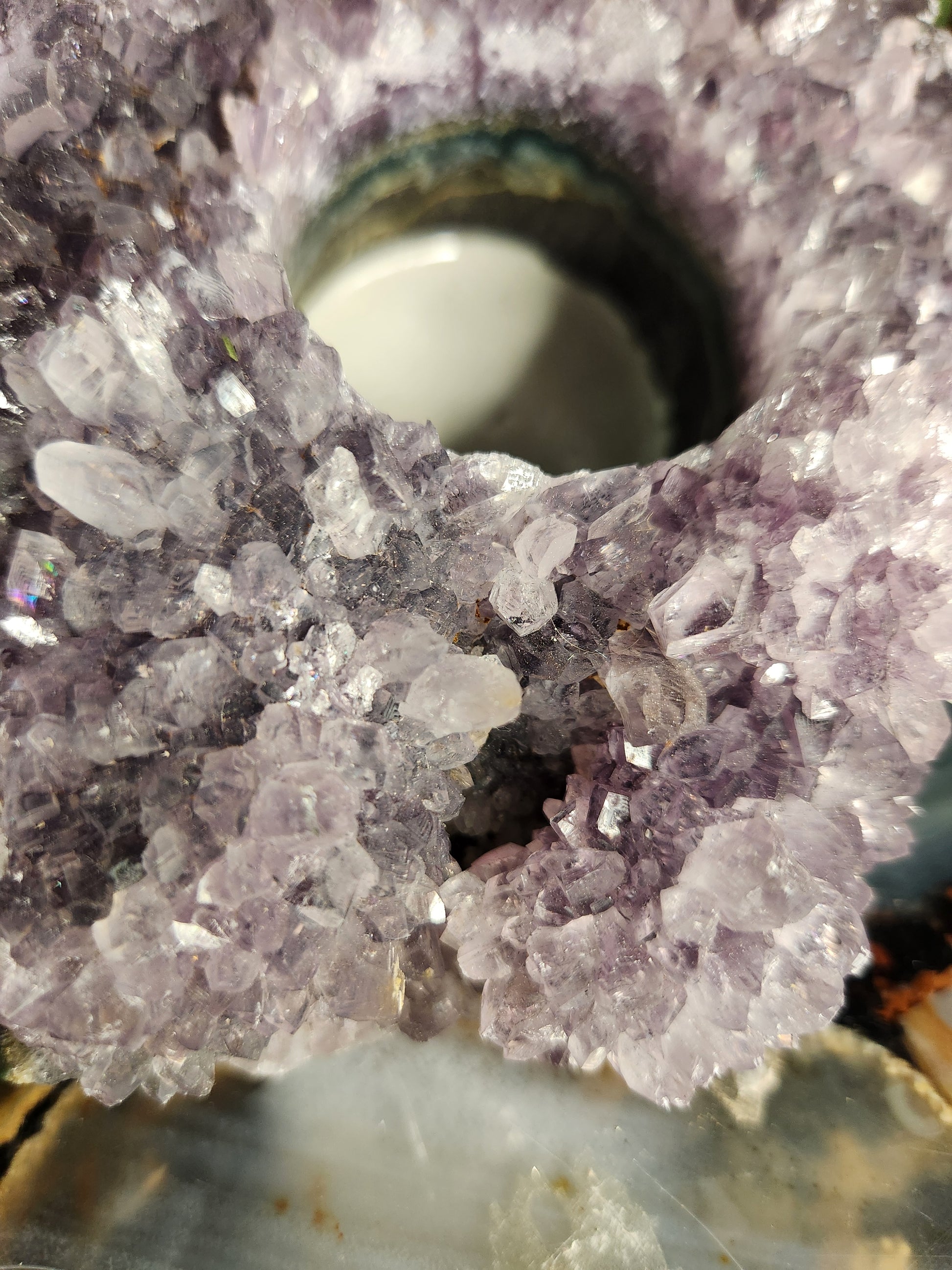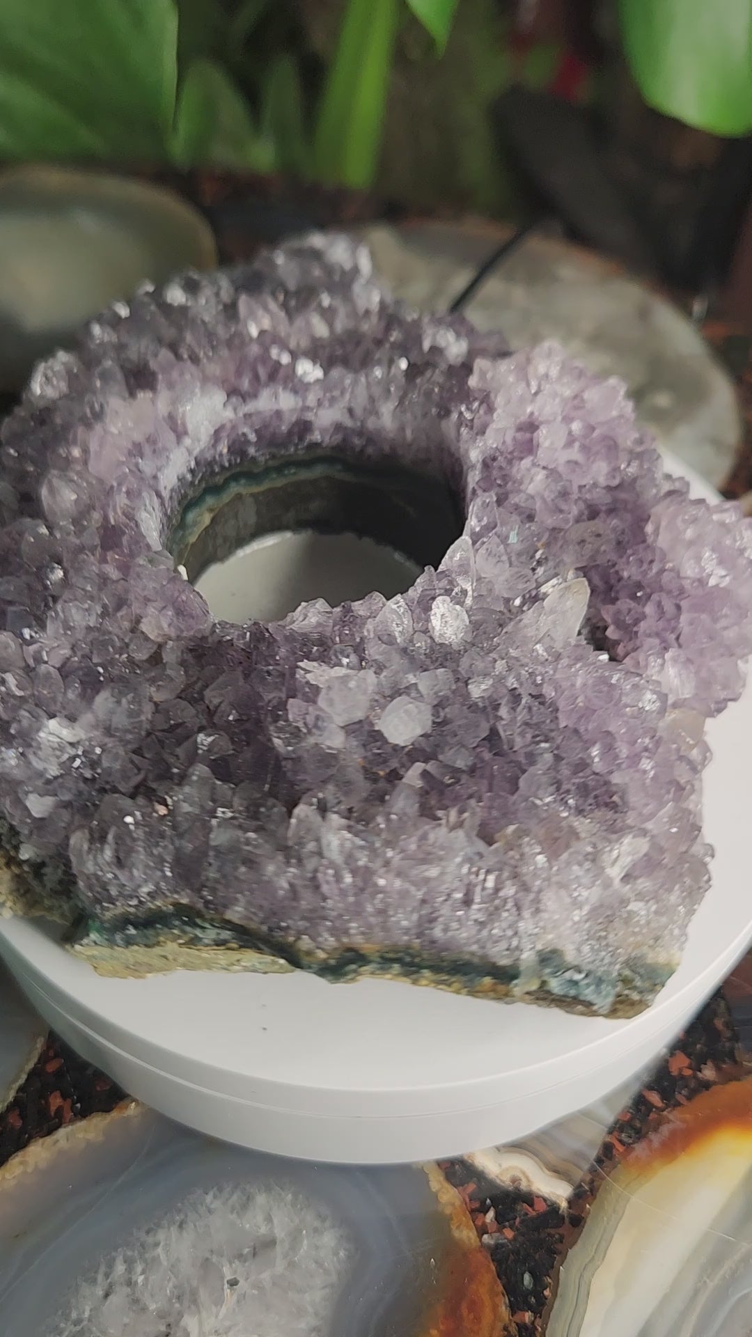 Features: Sparkling crystal points, polished rim, natural geode banding