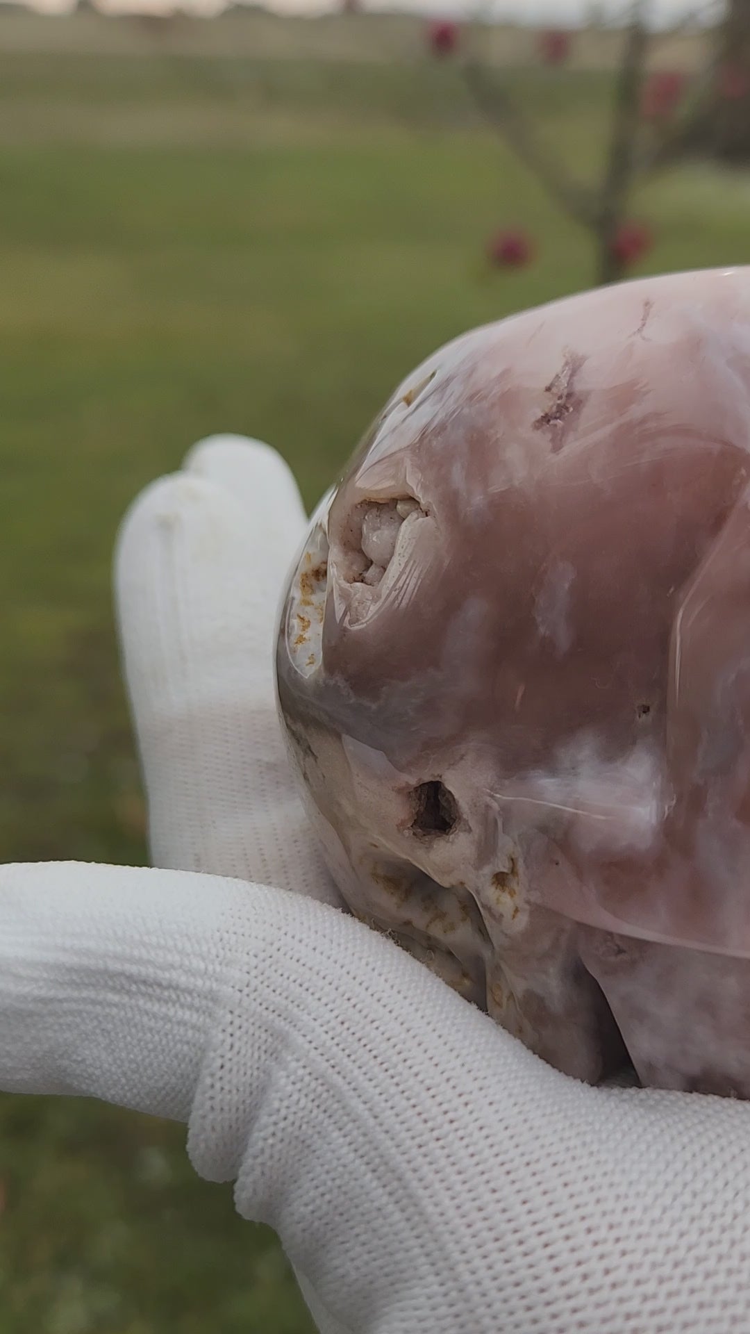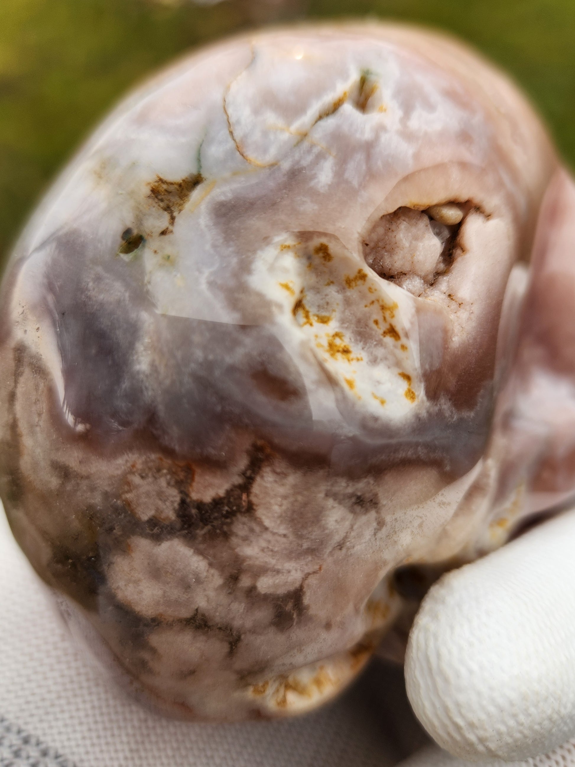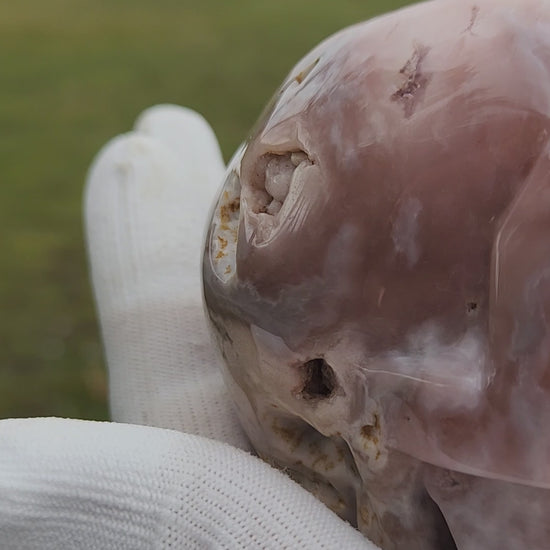 This gorgeous Flower Agate Skull Carving showcases soft pink, mauve, cream, and golden orbicular blooms, giving it a dreamy, cloud-like appearance from every angle. Highly polished and beautifully detailed, this piece is perfect for both collectors and metaphysical enthusiasts who appreciate rare, patterned agate formations.