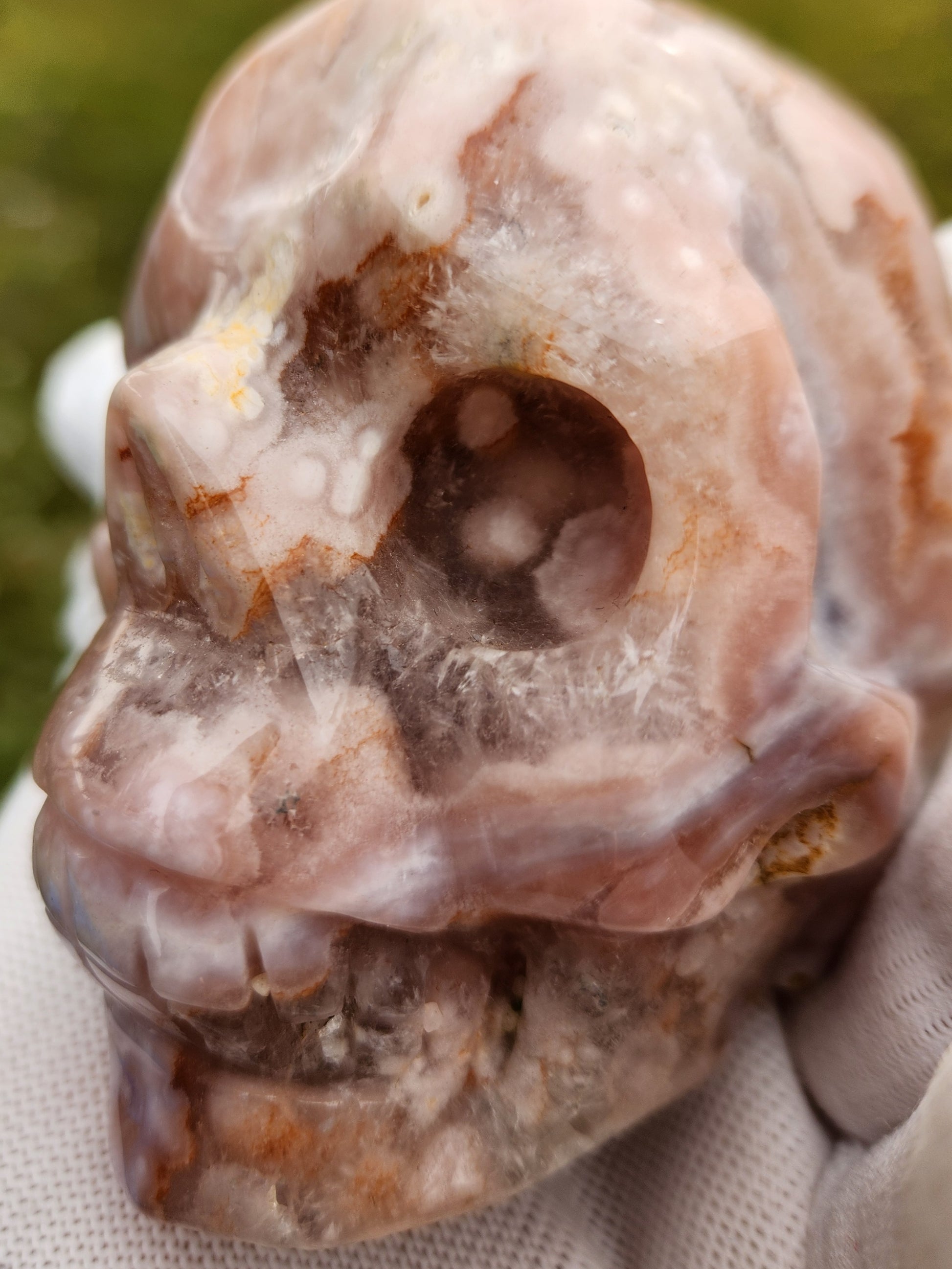 Flower Agate Skull Carving – Pink, White & Golden Orbicular Patterns – Premium Hand-Carved Stone