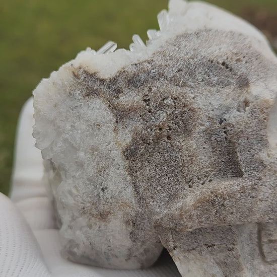 This unique hand-carved quartz crystal skull blends artistry with the raw beauty of nature. Featuring natural quartz clusters and druzy formations emerging from the side, this one-of-a-kind piece is both mystical and striking.