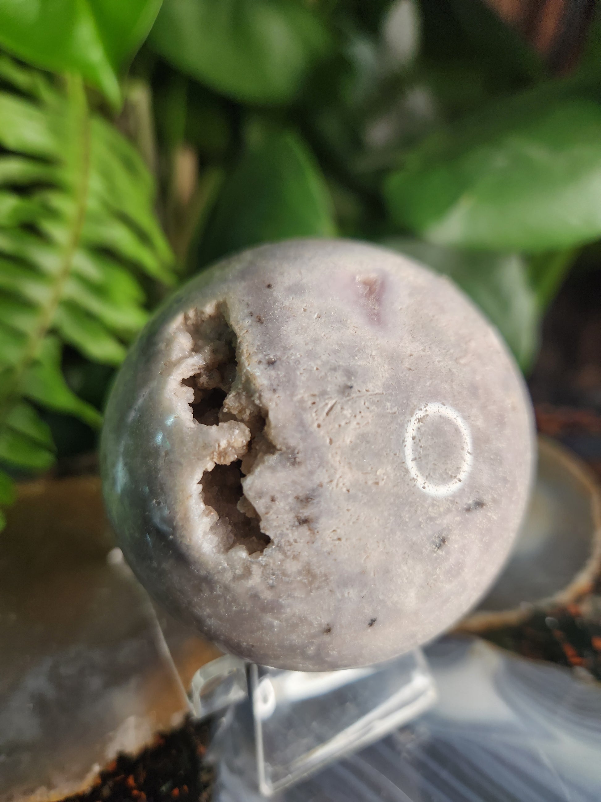 This stunning Pink Amethyst Druzy Sphere features natural geode openings filled with delicate druzy crystals, warm blush tones, and soft banding across the polished surface. Its combination of smooth finish and raw crystal pockets makes it a unique statement piece for collectors, healers, and décor lovers alike.