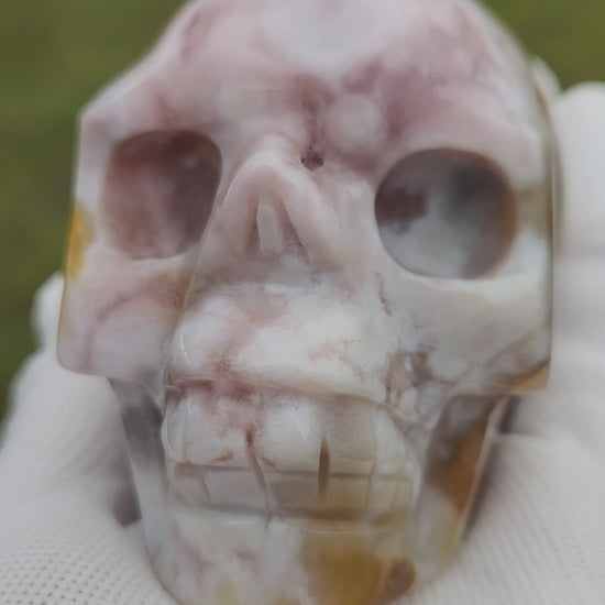 This gorgeous Flower Agate Skull Carving showcases soft pink, mauve, cream, and golden orbicular blooms, giving it a dreamy, cloud-like appearance from every angle. Highly polished and beautifully detailed, this piece is perfect for both collectors and metaphysical enthusiasts who appreciate rare, patterned agate formations.