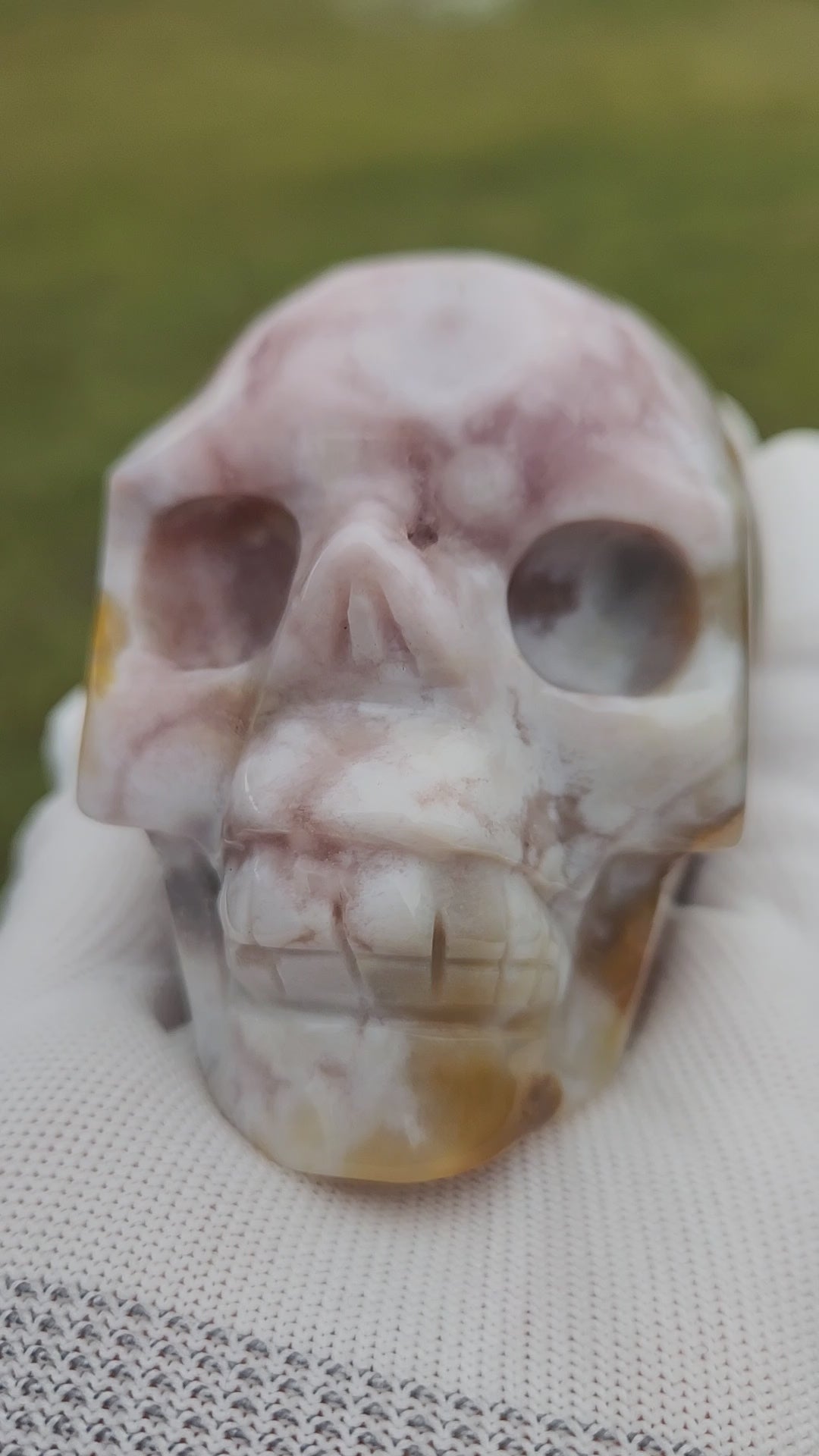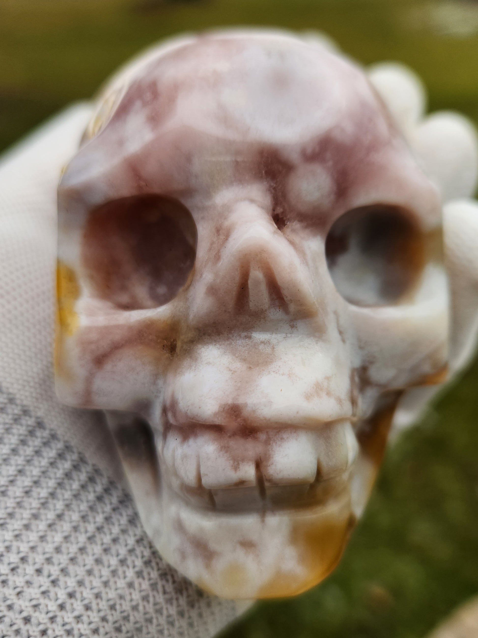 Flower Agate Skull Carving – Pink, White & Golden Orbicular Patterns – Premium Hand-Carved Stone