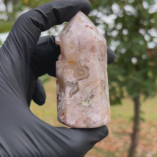 This exquisite Flower Agate Tower is a true marvel of nature expertly polished to showcase its intricate beauty. This stunning piece features captivating patterns resembling delicate cherry blossoms and floral plumes, rendered in soft hues of pink, cream, peach, and sometimes subtle greens and grays. Each 'bloom' tells a story, making this tower a unique and enchanting addition to any crystal collection or sacred space.