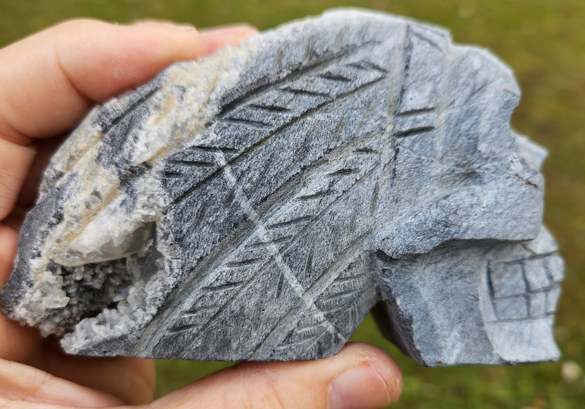 One-of-a-Kind Artwork: Tribal-style carvings meet raw natural crystal beauty.