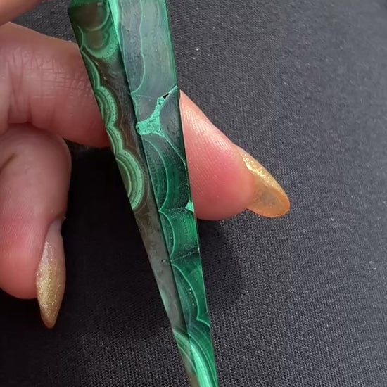 Crafted from a single piece of genuine malachite, this wand's polished surface reveals the stone's intricate patterns and rich, verdant hues. Malachite's powerful properties are believed to assist with deep emotional healing and protection. Its unique banding, often called "peacock's eye," makes each wand a one-of-a-kind work of art. The polished point is perfect for directing energy, while the smooth body fits comfortably in your hand, making it a powerful and beautiful addition to any crystal collection.