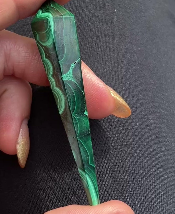 Experience the mesmerizing beauty and deep healing energy of this genuine Polished Malachite Wand — a timeless crystal of transformation, strength, and emotional balance.