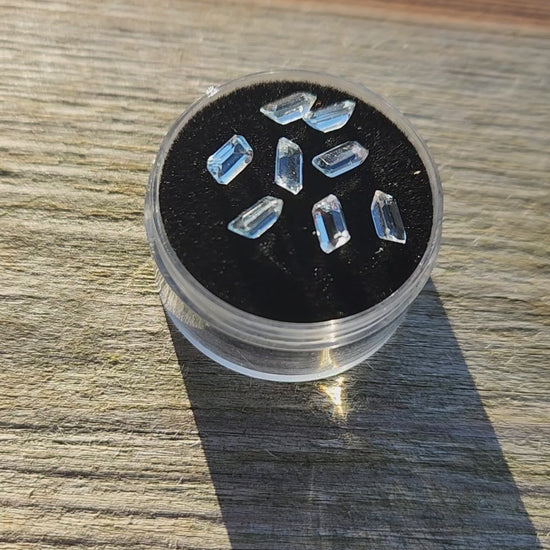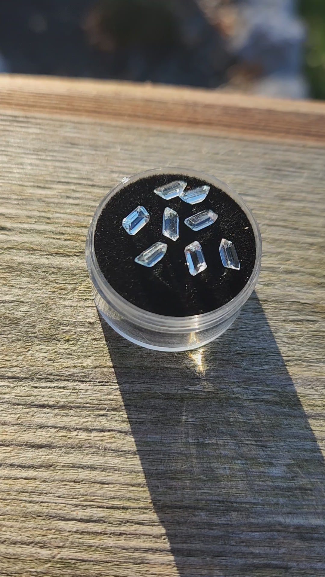 Bring the calm and clarity of ocean energy into your creations with this beautiful set of 8 faceted natural aquamarine gemstones, totaling approximately 2 carats. Each gem displays a serene sky-blue hue, exceptional clarity, and precision faceting that captures and reflects light beautifully.