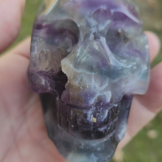 This hand-carved fluorite crystal skull is a rare masterpiece, blending stunning polished fluorite with natural druzy crystal formations. Featuring vibrant shades of purple, green, and clear fluorite, this skull displays a mesmerizing contrast between its smooth, carved surfaces and raw sparkling druzy pockets.