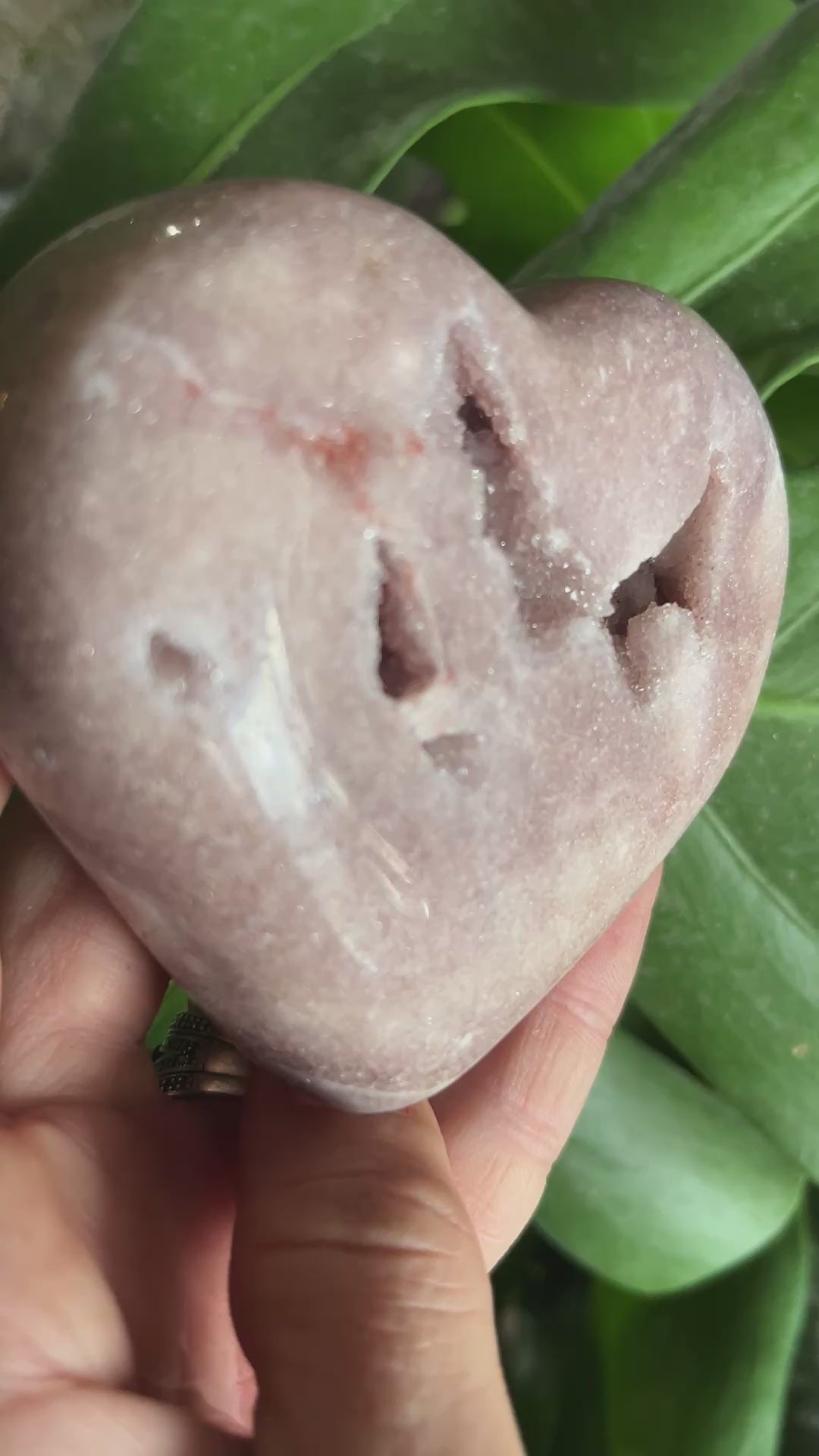 Pink Amethyst (sometimes referred to as Rose Amethyst or a light-colored Amethyst) is highly valued for its gentle, heart-centered energy. Carved into the loving shape of a heart, this specimen is a powerful piece for emotional healing and connection. The sparkling druzy pocket adds an element of magic and rarity.