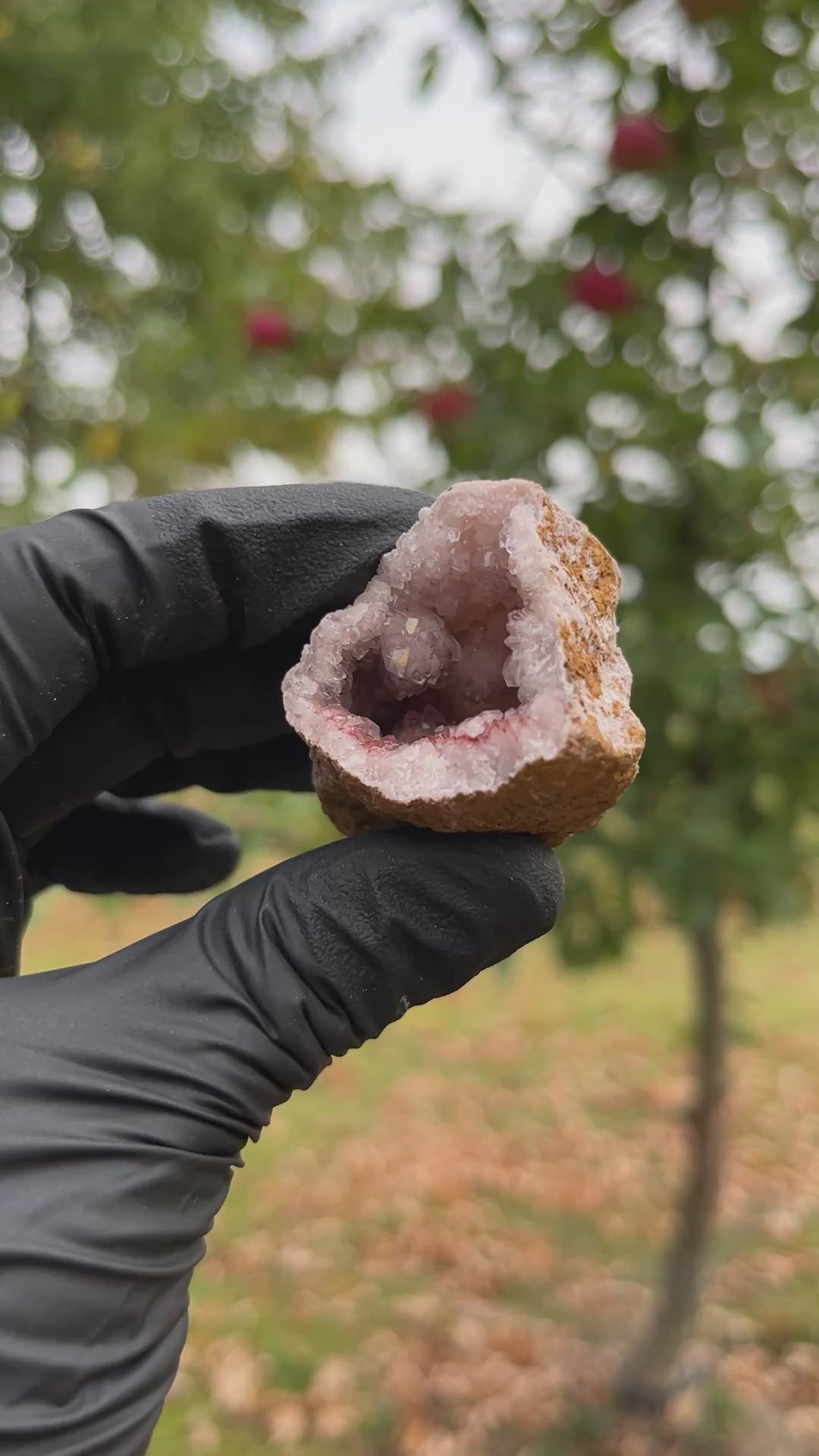 Open your heart to this beautiful, one-of-a-kind Pink Amethyst Geode. Unlike the common purple variety, this rare form of Amethyst has a soft, delicate pink hue, a result of Hematite inclusions during its formation. This stunning geode features a cavern of sparkling, druzy crystals that catch the light from every angle, making it a mesmerizing piece of natural art for your space.