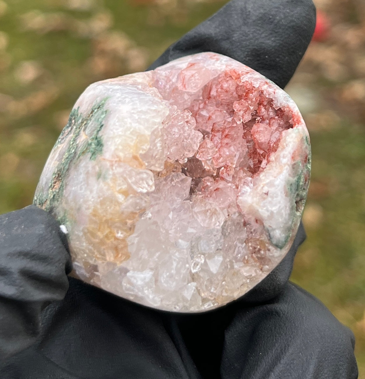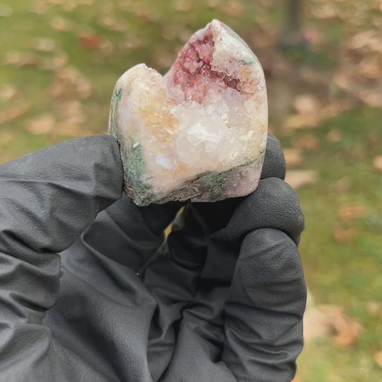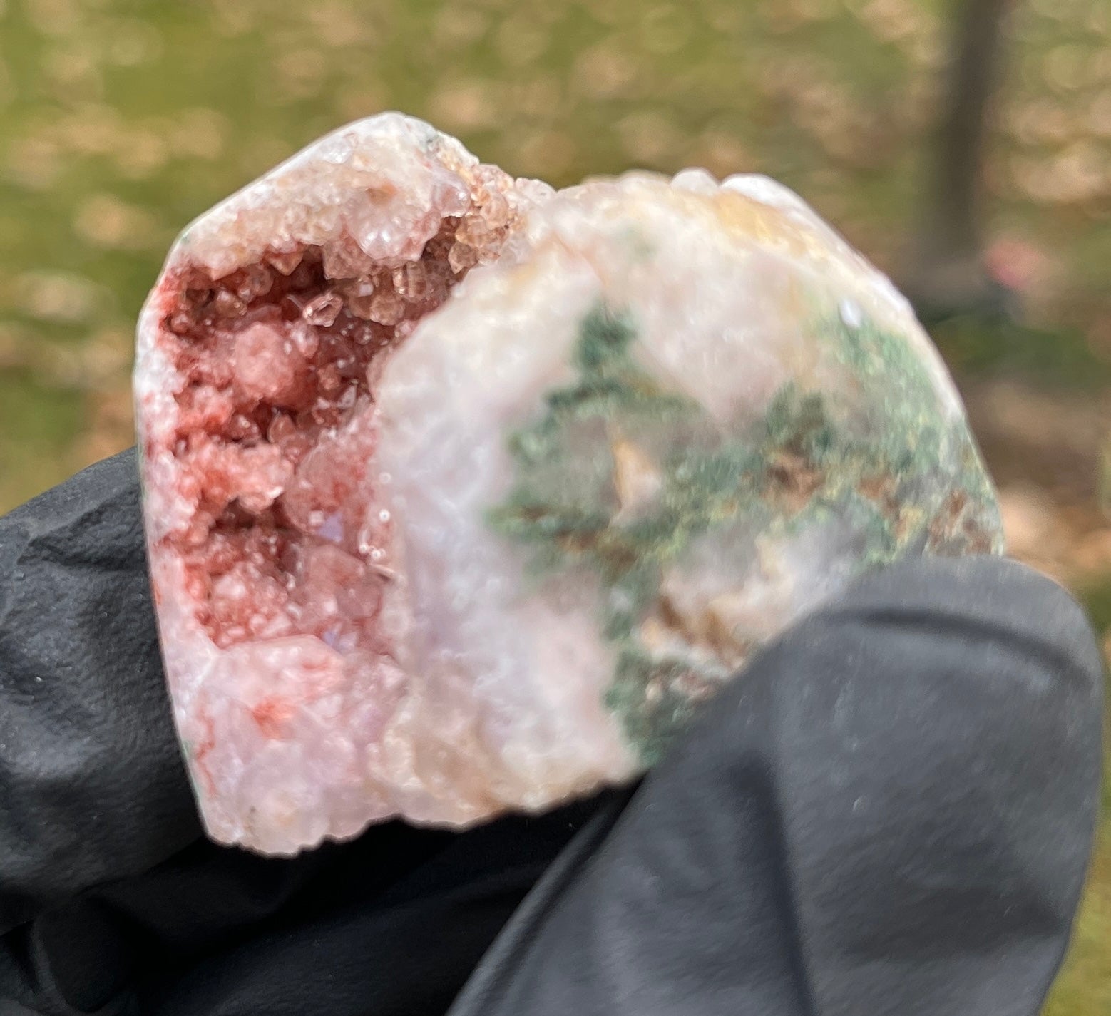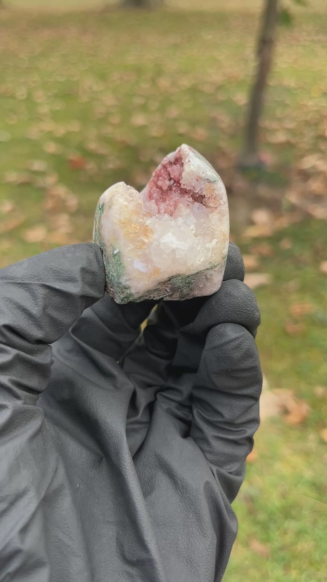 What makes this specimen truly unique is its intricate rind—the exterior is a beautifully banded Agate or Chalcedony, with rich mossy green and white inclusions that create a stunning visual contrast to the soft pink interior. It is an exceptional "freeform" piece, showcasing the natural process of geode formation.