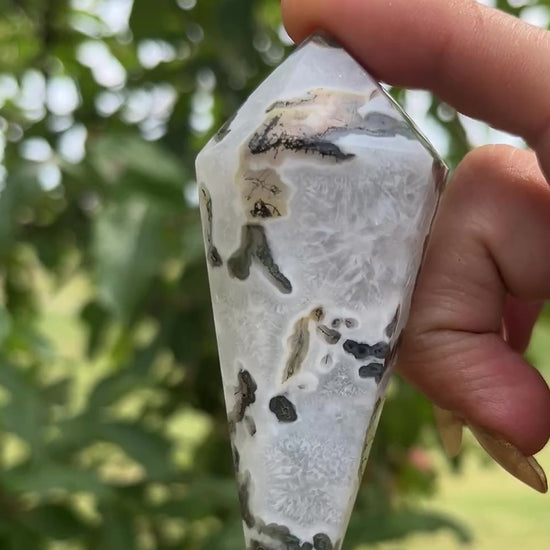 Moss Agate is not a true agate, as it lacks the traditional banding, but is rather a form of chalcedony with stunning dendritic inclusions. These mineral formations, often composed of manganese or iron oxide, create intricate, moss-like or tree-like patterns within a translucent or milky-white base. The color of these inclusions can range from vibrant emerald green to earthy browns and reds, making each wand a one-of-a-kind piece of natural art.