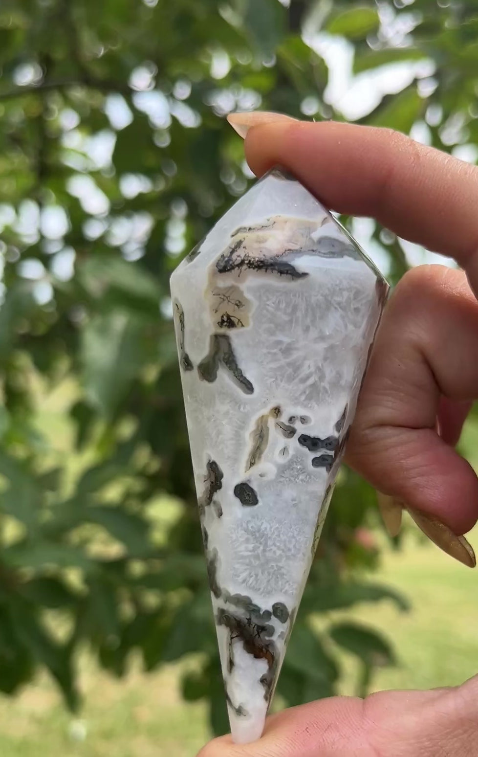 • Abundance and Growth: Moss Agate is a stone of growth in all forms—physical, spiritual, and emotional. It is said to attract prosperity and abundance, helping to manifest desires and bring new ideas to fruition. The wand can be used to direct this energy toward personal goals, a new business venture, or even a garden.