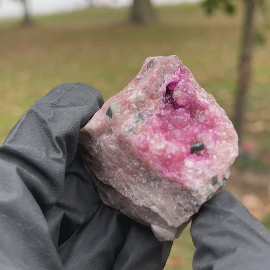 Discover the vibrant, high-vibrational energy of this spectacular Cobaltoan Calcite specimen. Often nicknamed the "Aphrodite Stone," this piece features a stunning cavity lined with hot pink, sugary Cobaltoan Calcite druzy crystals.