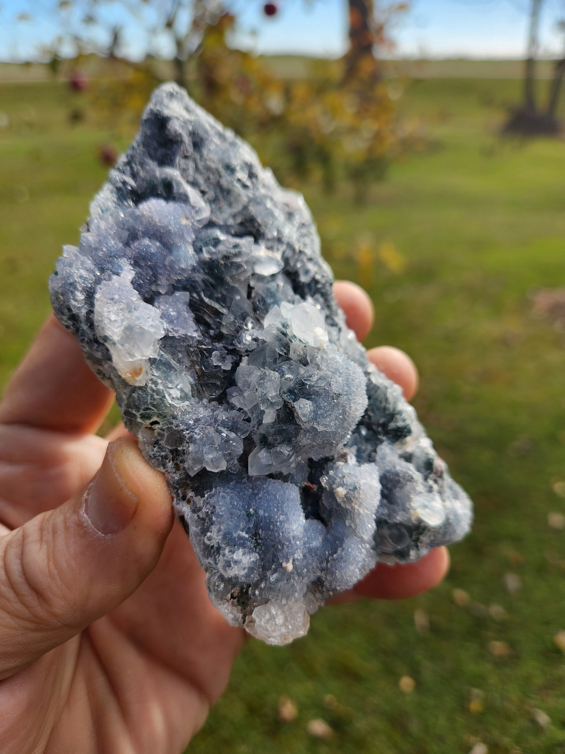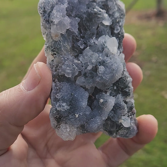 This stunning Natural Zeolite Crystal Cluster showcases radiant blue and white crystal formations of apophyllite and stilbite on a dark basalt matrix — a remarkable specimen from the volcanic regions of Maharashtra, India, famous for world-class zeolite minerals.
