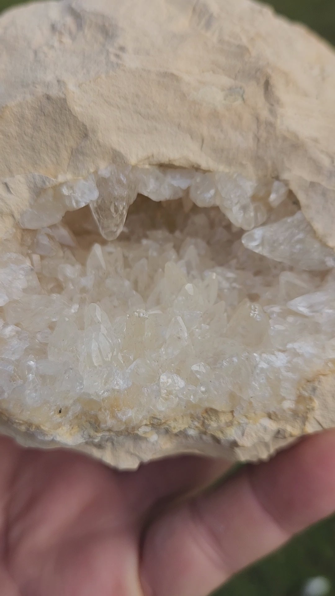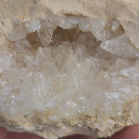 Discover the raw beauty of this natural Moroccan quartz geode, featuring a fully opened cavity packed with bright, glassy crystal points. The exterior shows the classic sandy Moroccan matrix, while the interior reveals a stunning cluster of clear to pale-honey quartz points that shimmer beautifully under any light. A perfect piece for collectors, décor lovers, and spiritual practitioners alike.